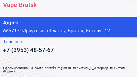 Vape Bratsk по адресу 665717, Иркутская область, Братск, Янгеля, 12 в дальнейшем Организация, размещена в следующих категориях: