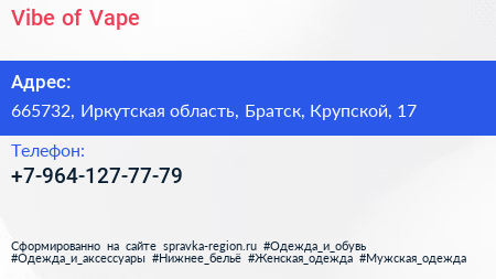 Vibe of Vape по адресу 665732, Иркутская область, Братск, Крупской, 17 в дальнейшем Организация, размещена в следующих категориях: