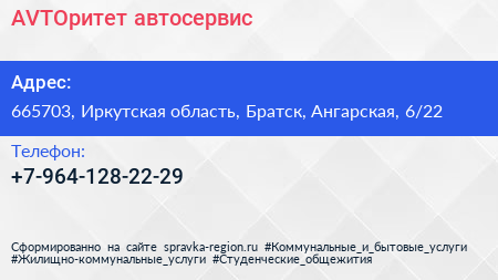 AVTOритет, автосервис по адресу 665703, Иркутская область, Братск, Ангарская, 6/22 в дальнейшем Организация, размещена в следующих категориях: