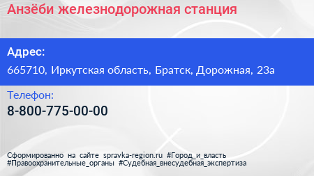 Анзёби, железнодорожная станция по адресу 665710, Иркутская область, Братск, Дорожная, 23а в дальнейшем Организация, размещена в следующих категориях: