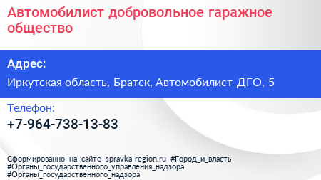 Автомобилист, добровольное гаражное общество по адресу Иркутская область, Братск, Автомобилист ДГО, 5 в дальнейшем Организация, размещена в следующих категориях:
