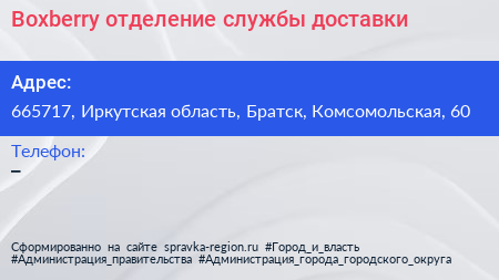 Boxberry, отделение службы доставки по адресу 665717, Иркутская область, Братск, Комсомольская, 60 в дальнейшем Организация, размещена в следующих категориях: