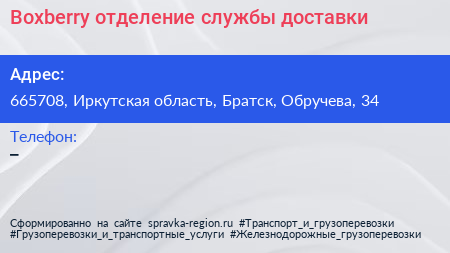 Boxberry, отделение службы доставки по адресу 665708, Иркутская область, Братск, Обручева, 34 в дальнейшем Организация, размещена в следующих категориях: