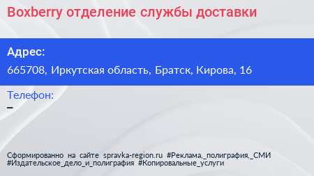 Boxberry, отделение службы доставки по адресу 665708, Иркутская область, Братск, Кирова, 16 в дальнейшем Организация, размещена в следующих категориях: