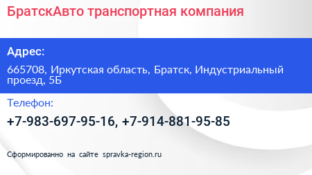 БратскАвто, транспортная компания по адресу 665708, Иркутская область, Братск, Индустриальный проезд, 5Б в дальнейшем Организация, размещена в следующих категориях:
