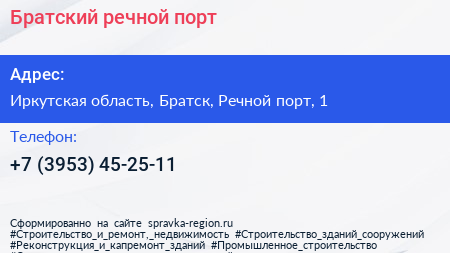 Братский речной порт по адресу Иркутская область, Братск, Речной порт, 1 в дальнейшем Организация, размещена в следующих категориях:
