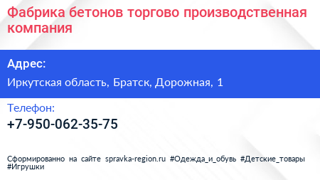 Фабрика бетонов, торгово-производственная компания по адресу Иркутская область, Братск, Дорожная, 1 в дальнейшем Организация, размещена в следующих категориях: