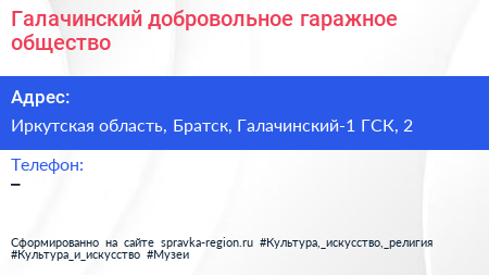 Галачинский, добровольное гаражное общество по адресу Иркутская область, Братск, Галачинский-1 ГСК, 2 в дальнейшем Организация, размещена в следующих категориях: