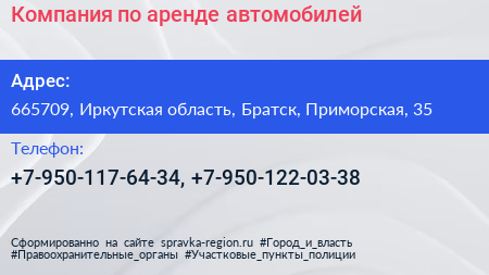 Компания по аренде автомобилей по адресу 665709, Иркутская область, Братск, Приморская, 35 в дальнейшем Организация, размещена в следующих категориях: