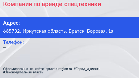 Компания по аренде спецтехники по адресу 665732, Иркутская область, Братск, Боровая, 1а в дальнейшем Организация, размещена в следующих категориях: