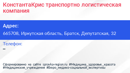 КонстантаКрис, транспортно-логистическая компания по адресу 665708, Иркутская область, Братск, Депутатская, 32 в дальнейшем Организация, размещена в следующих категориях: