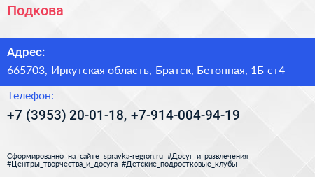 Подкова по адресу 665703, Иркутская область, Братск, Бетонная, 1Б ст4 в дальнейшем Организация, размещена в следующих категориях:
