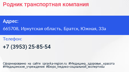 Родник, транспортная компания по адресу 665708, Иркутская область, Братск, Южная, 33а в дальнейшем Организация, размещена в следующих категориях: