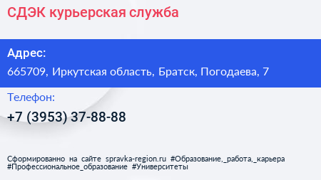 СДЭК, курьерская служба по адресу 665709, Иркутская область, Братск, Погодаева, 7 в дальнейшем Организация, размещена в следующих категориях:
