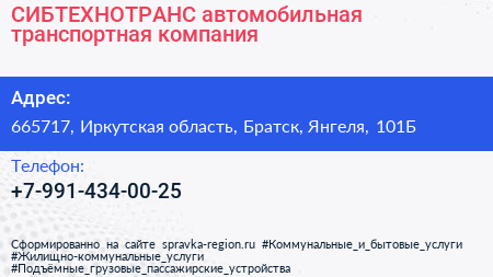 СИБТЕХНОТРАНС, автомобильная транспортная компания по адресу 665717, Иркутская область, Братск, Янгеля, 101Б в дальнейшем Организация, размещена в следующих категориях: