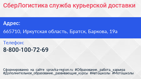 СберЛогистика, служба курьерской доставки по адресу 665710, Иркутская область, Братск, Баркова, 19а в дальнейшем Организация, размещена в следующих категориях:
