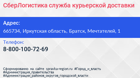СберЛогистика, служба курьерской доставки по адресу 665734, Иркутская область, Братск, Мечтателей, 1 в дальнейшем Организация, размещена в следующих категориях: