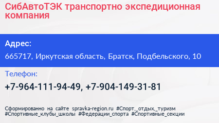 СибАвтоТЭК, транспортно-экспедиционная компания по адресу 665717, Иркутская область, Братск, Подбельского, 10 в дальнейшем Организация, размещена в следующих категориях: