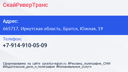 СкайРиверТранс по адресу 665717, Иркутская область, Братск, Южная, 19 в дальнейшем Организация, размещена в следующих категориях:
