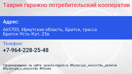 Таврия, гаражно-потребительский кооператив по адресу 665703, Иркутская область, Братск, трасса Братск-Усть-Кут, 21в в дальнейшем Организация, размещена в следующих категориях: