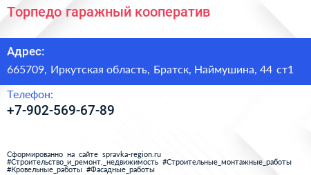 Торпедо, гаражный кооператив по адресу 665709, Иркутская область, Братск, Наймушина, 44 ст1 в дальнейшем Организация, размещена в следующих категориях: