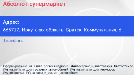 Абсолют, супермаркет по адресу 665717, Иркутская область, Братск, Коммунальная, 6 в дальнейшем Организация, размещена в следующих категориях: