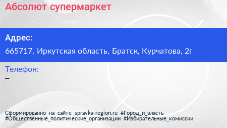 Абсолют, супермаркет по адресу 665717, Иркутская область, Братск, Курчатова, 2г в дальнейшем Организация, размещена в следующих категориях: