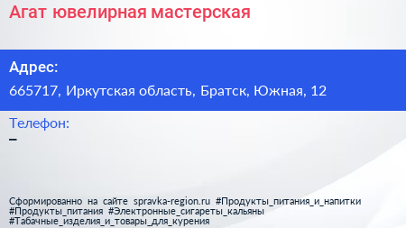 Агат, ювелирная мастерская по адресу 665717, Иркутская область, Братск, Южная, 12 в дальнейшем Организация, размещена в следующих категориях: