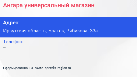 Ангара, универсальный магазин по адресу Иркутская область, Братск, Рябикова, 33а в дальнейшем Организация, размещена в следующих категориях: