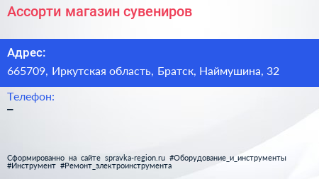 Ассорти, магазин сувениров по адресу 665709, Иркутская область, Братск, Наймушина, 32 в дальнейшем Организация, размещена в следующих категориях: