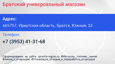 Братский, универсальный магазин по адресу 665717, Иркутская область, Братск, Южная, 12 в дальнейшем Организация, размещена в следующих категориях: