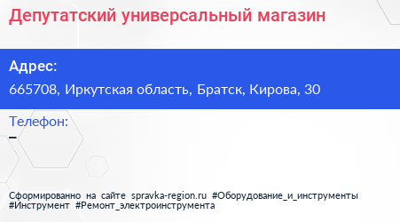 Депутатский, универсальный магазин по адресу 665708, Иркутская область, Братск, Кирова, 30 в дальнейшем Организация, размещена в следующих категориях: