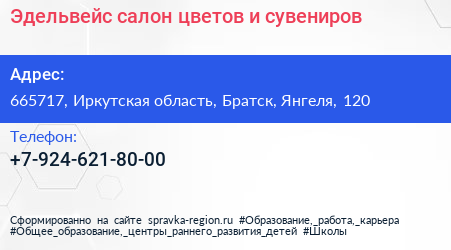 Эдельвейс, салон цветов и сувениров по адресу 665717, Иркутская область, Братск, Янгеля, 120 в дальнейшем Организация, размещена в следующих категориях:
