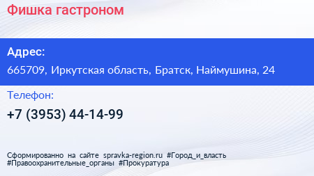 Фишка, гастроном по адресу 665709, Иркутская область, Братск, Наймушина, 24 в дальнейшем Организация, размещена в следующих категориях: