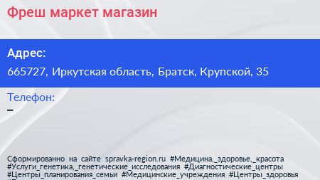 Фреш маркет, магазин по адресу 665727, Иркутская область, Братск, Крупской, 35 в дальнейшем Организация, размещена в следующих категориях: