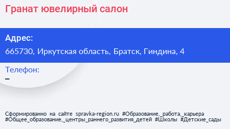 Гранат, ювелирный салон по адресу 665730, Иркутская область, Братск, Гиндина, 4 в дальнейшем Организация, размещена в следующих категориях: