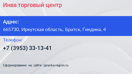 Инва, торговый центр по адресу 665730, Иркутская область, Братск, Гиндина, 4 в дальнейшем Организация, размещена в следующих категориях: