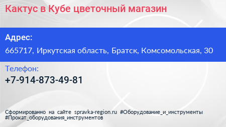 Кактус в Кубе, цветочный магазин по адресу 665717, Иркутская область, Братск, Комсомольская, 30 в дальнейшем Организация, размещена в следующих категориях: