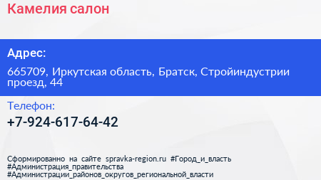 Камелия, салон по адресу 665709, Иркутская область, Братск, Стройиндустрии проезд, 44 в дальнейшем Организация, размещена в следующих категориях: