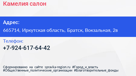 Камелия, салон по адресу 665714, Иркутская область, Братск, Вокзальная, 2в в дальнейшем Организация, размещена в следующих категориях: