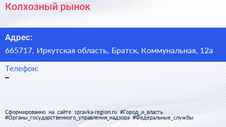 Колхозный, рынок по адресу 665717, Иркутская область, Братск, Коммунальная, 12а в дальнейшем Организация, размещена в следующих категориях:
