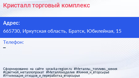 Кристалл, торговый комплекс по адресу 665730, Иркутская область, Братск, Юбилейная, 15 в дальнейшем Организация, размещена в следующих категориях: