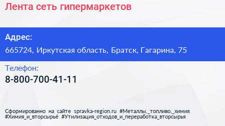 Лента, сеть гипермаркетов по адресу 665724, Иркутская область, Братск, Гагарина, 75 в дальнейшем Организация, размещена в следующих категориях:
