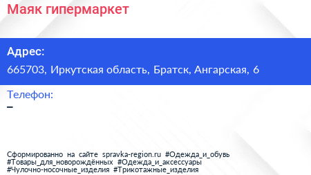 Маяк, гипермаркет по адресу 665703, Иркутская область, Братск, Ангарская, 6 в дальнейшем Организация, размещена в следующих категориях: