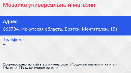 Мозайка, универсальный магазин по адресу 665734, Иркутская область, Братск, Мечтателей, 15а в дальнейшем Организация, размещена в следующих категориях: