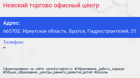 Невский, торгово-офисный центр по адресу 665702, Иркутская область, Братск, Гидростроителей, 55 в дальнейшем Организация, размещена в следующих категориях: