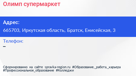 Олимп, супермаркет по адресу 665703, Иркутская область, Братск, Енисейская, 3 в дальнейшем Организация, размещена в следующих категориях: