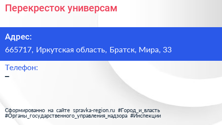 Перекресток, универсам по адресу 665717, Иркутская область, Братск, Мира, 33 в дальнейшем Организация, размещена в следующих категориях: