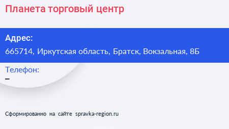 Планета, торговый центр по адресу 665714, Иркутская область, Братск, Вокзальная, 8Б в дальнейшем Организация, размещена в следующих категориях: