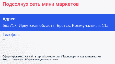 Подсолнух, сеть мини-маркетов по адресу 665717, Иркутская область, Братск, Коммунальная, 11а в дальнейшем Организация, размещена в следующих категориях: